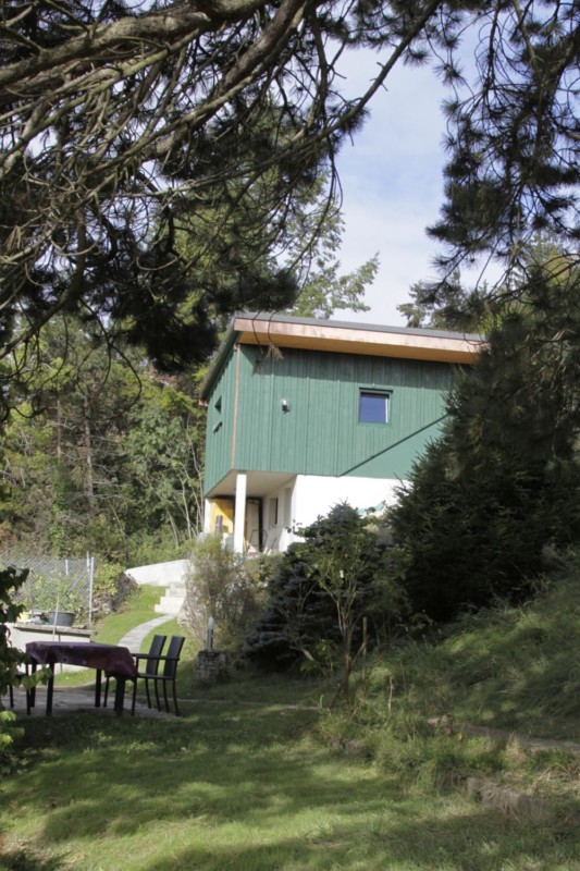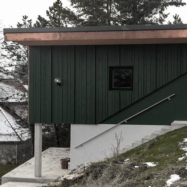 La conception de ce garage se voulait légère, semblant voler en étant posé sur deux piliers, offrant une vue panoramique sur la vallée. Le bardage, issu d’une scierie locale, est recouvert d’une peinture rappelant les épines d’épicéas environnants. La toiture à un seul pan recouvre l’escalier latéral, conférant au bâtiment un aspect contemporain.