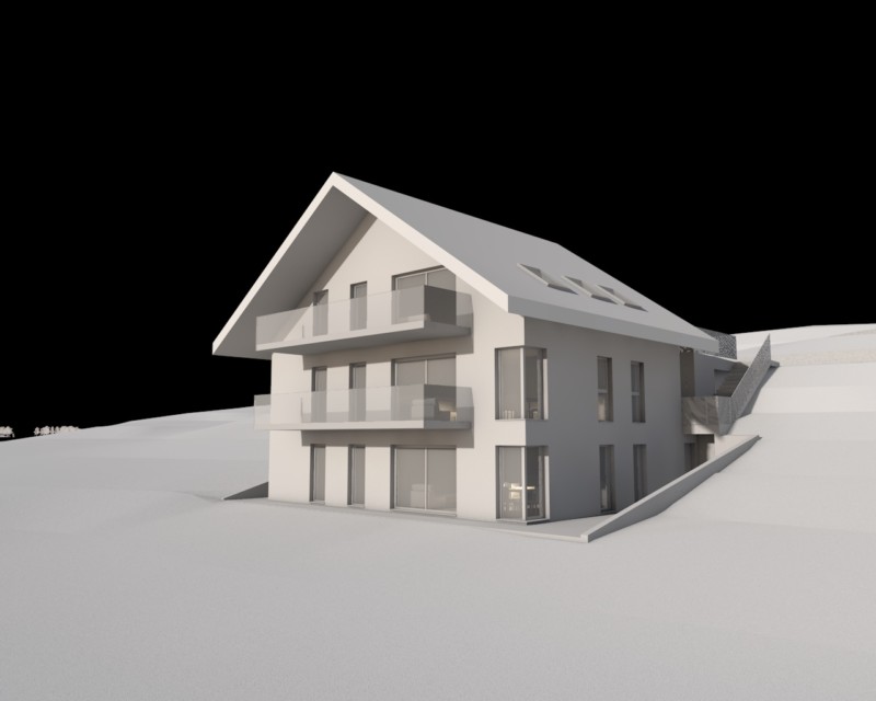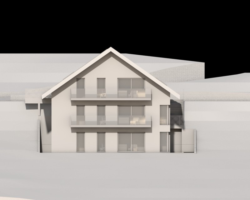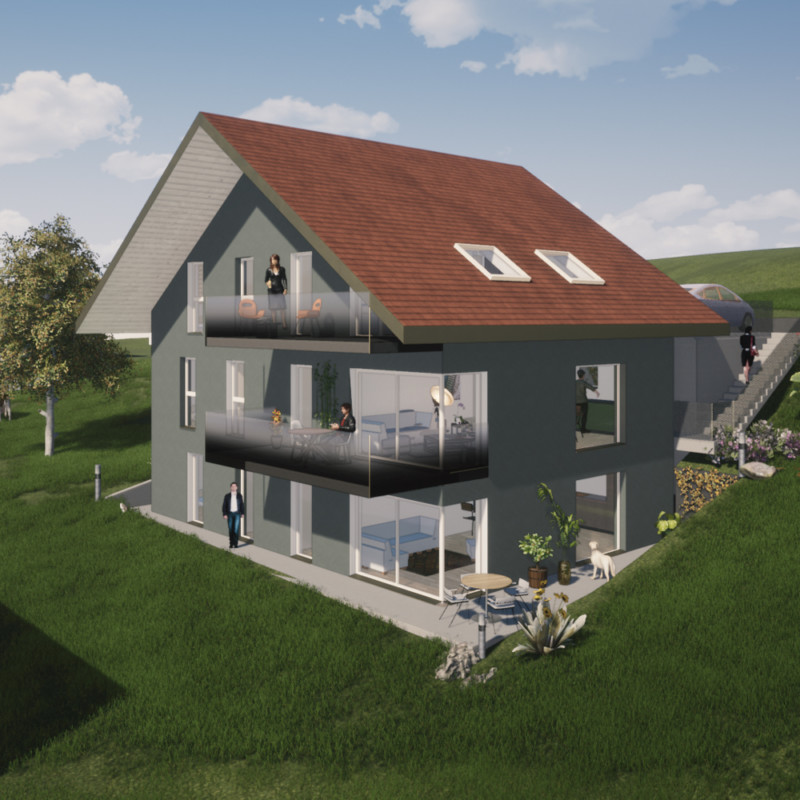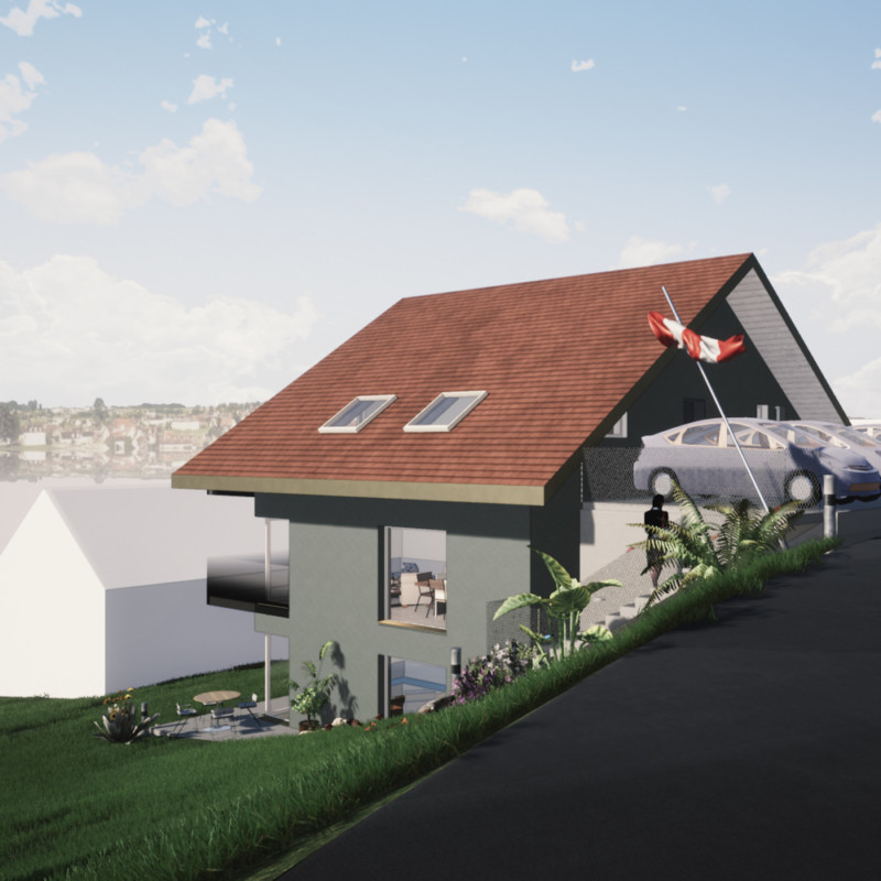 Construction d’un immeuble de trois logements sur un terrain à forte pente, offrant une vue panoramique sur le lac de Neuchâtel. L’immeuble est placé en bas de la pente pour respecter les gabarits voisins, avec un accès par le haut.