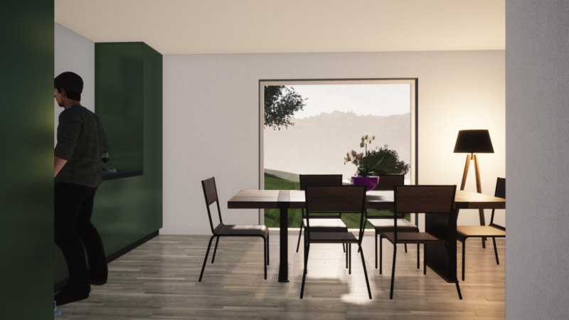 Les pièces de service sont situées contre la pente, tandis que les pièces de vie se trouvent en aval. La conception inclut un volume de soutènement pour les caves, sur lequel se placent les parkings. Un espace tampon abrite la circulation (passerelle, escalier), puis le bâtiment prend place avec à chaque étage une typologie identique où les espaces de service coulissent pour laisser place au hall d’entrée.