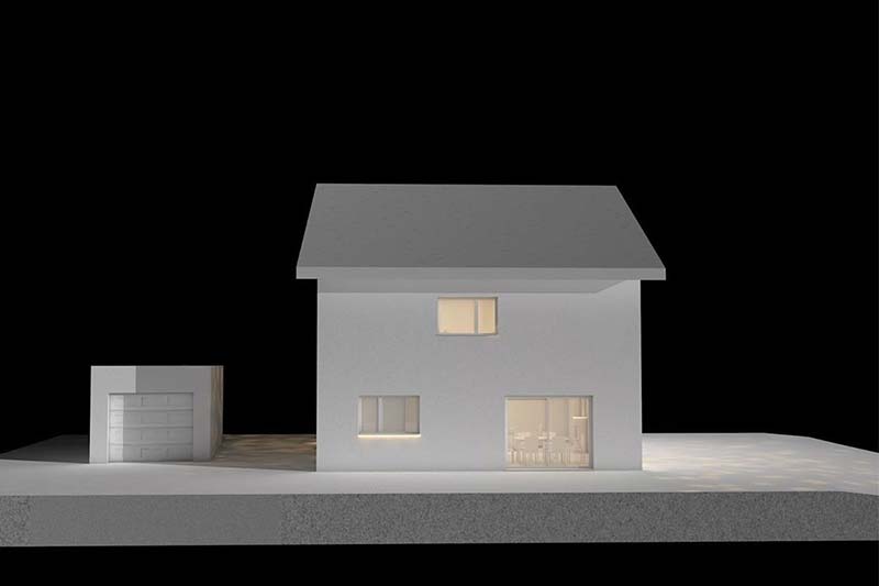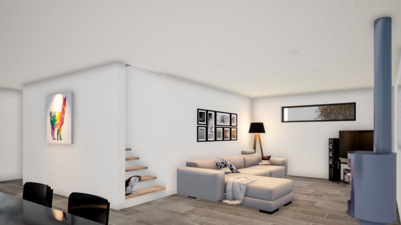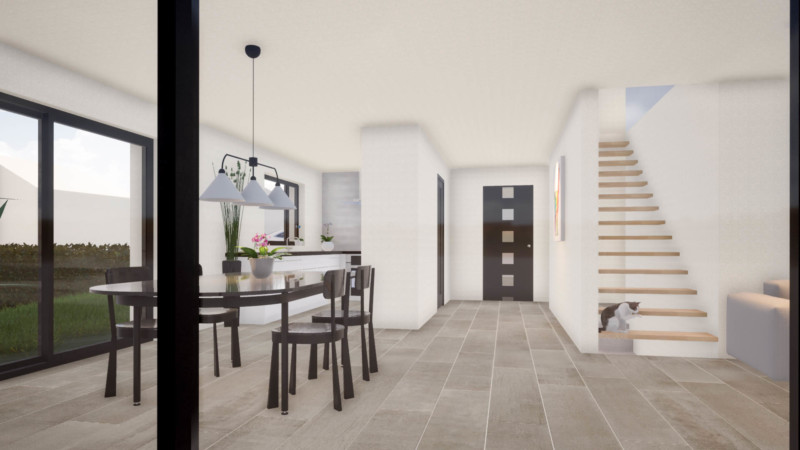 La volumétrie du bâtiment est pensée pour être à la fois fonctionnelle et épurée. À l’intérieur, le plan est rythmé autour d’un escalier droit central ,orienté nord, qui apporte de la lumière au cœur de la villa. Cet escalier permet une modulation flexible de l’espace grâce à son inscription entre les deux seuls murs porteurs intérieurs.
