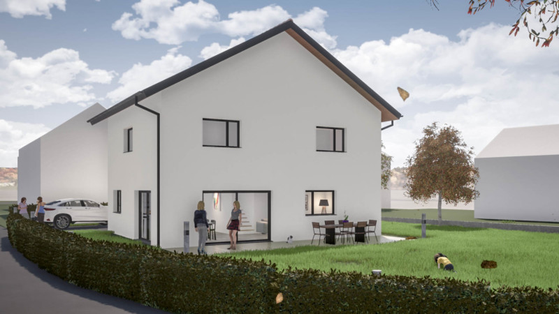 La villa individuelle est implantée sur la partie haute de la parcelle, située à un carrefour. Elle est positionnée en retrait de la route pour offrir des vues dégagées et favoriser la tranquillité des occupants.